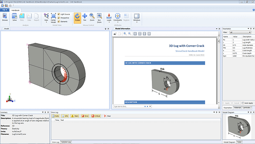 The CAE Handbook is a form of templating. An expert FEA user can set up a model with one or more parts using Linear, Modal, Buckling or Nonlinear StressCheck solver solutions. In the case of the cracked lug, the Contour Integral Method is used to predict the required Stress Intensity Factors. The Model Information window, Parameters window and all the other input windows can be set up by the expert, following the guidelines in the CAE Handbook author’s guide. This is ideal for companies with repetitive analysis requirements. In my case, some 40 years ago I had to carry out exhaustive lug damage tolerance analyses checks on the Tornado combat aircraft. A tool like this would have meant turning that work around far more quickly and delegating much of the analyses.