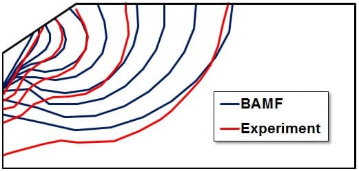 Predicted crack front evolution (blue) compares favorably with the observed experimental result (red):