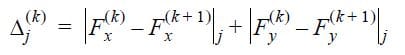 By definition, the jump (Δ) is the sum of the absolute values of the differences in stress resultants. An element (k) has as many Δ’s as there are shared edges/faces. The largest Δ of the element (Δk) is then divided by the sum of all the jumps over all the elements (ΔT) to obtain a relative jump for that element (Φk=Δk/ΔT). The error indicator is the ratio between Φk of the element and the largest Φk for all the elements in the mesh (ηk = Φk/Φkmax).