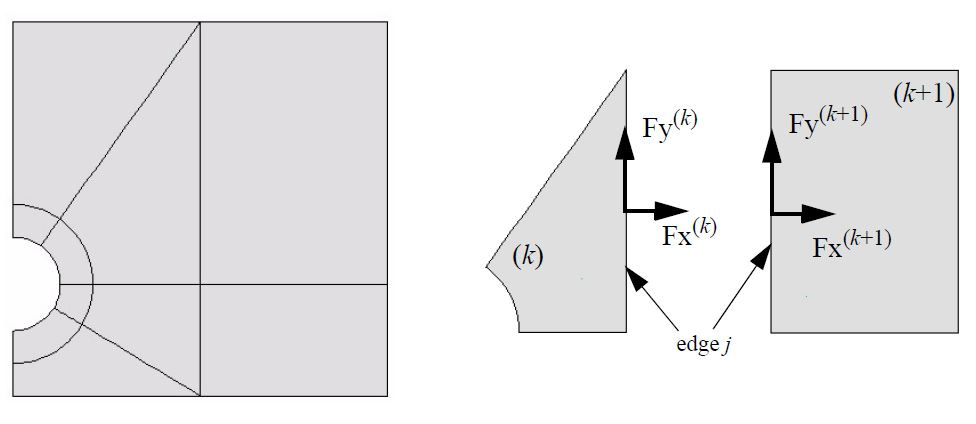 To compute the error indicator, the program first determines the jumps in the stress resultants across any shared edges (2D, as shown in Figure 4) or faces (3D). For example, the jump for shared edge j of element k for a planar (2D) problem is given by:
