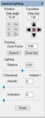 The Camera/Lighting dialog contains input fields for controlling the size of each dynamic display rotation step, translation step, and zoom factor, as well as lighting controls.
