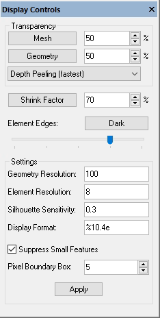 - Within the Display Controls dialog, you may control the transparency of mesh and geometry objects (Transparency buttons and fields), and the shrink option for the elements (Shrink Factor button and field).