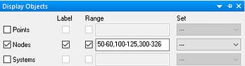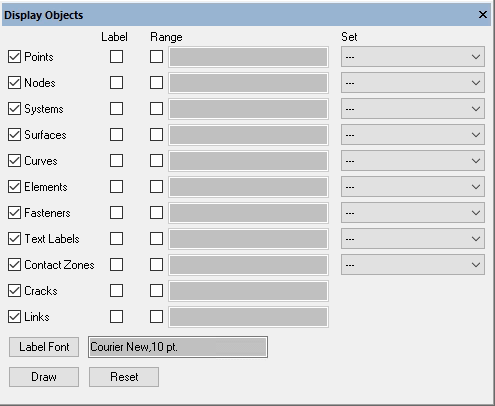 The Display > Display Objects pane (Figure 4) provides a mechanism for controlling the display, labeling, range and set filtering for each object type (Nodes, Elements, Surfaces, Curves, etc.).