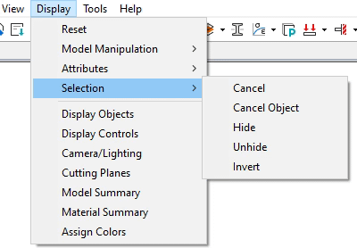 The Display > Selection menu (Figure 3) provides a mechanism for controlling the display of selected or hidden objects.