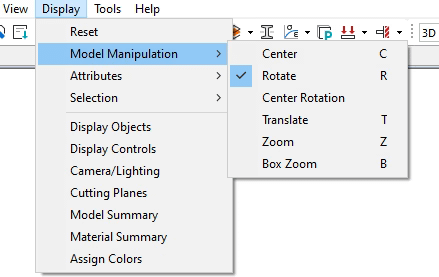 There are several ways to manipulate the contents and appearance of the graphic display information for a model. These options are contained in the Display pulldown menu in the Main Menu Bar, in the Display Objects pane (Display > Display Objects), in the Cutting Planes pane (Display > Cutting Planes), and in the Display Controls pane (Display > Display Controls).