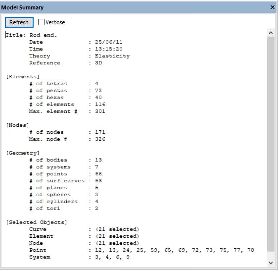 Display > Model Summary allows you to obtain a summary of model information such as the number of elements and number of nodes (Figure 7). In addition, currently selected objects (if any) are summarized by type at the bottom of the Model Summary pane.