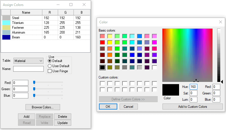 - The User Default color table is similar to the Default color table, except that it is preserved in the StressCheck project file for the current model. Each model may have its own User Default color table which may be activated from the Display > Assign Colors interface as a substitute for the standard Default color table.