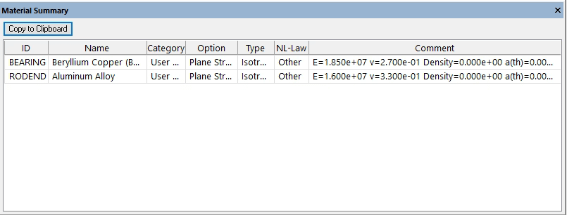 The Material Summary carries useful information about the material including its ID, Name, type (isotropic, orthotropic, anisotropic) its nonlinear behavior law (Ramberg-Osgood, Elastoplastic, Bilinear, etc.), and material coefficients among others.