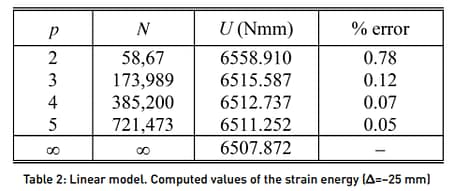 Table 2 summarizes the computed values of strain energy, U, associated with each polynomial level, p, and degrees of freedom, N: