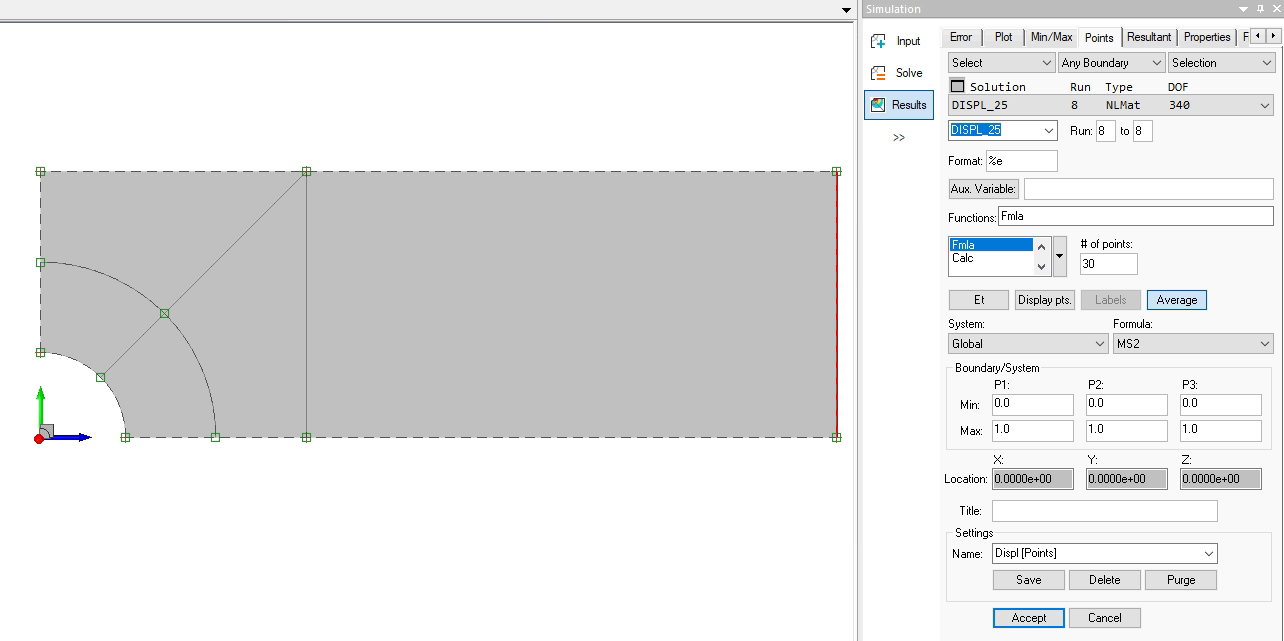 - Points tab > Select > Any Boundary > Selection > Solution: NSOL (for Margin Check any name in this field will be ignored) > Run: 8 to 8 (same for this field) > Func: Fmla > # of pts: 30 > Average switch on > Formula: MS2 > Settings Name: Displ (this is the name that will appears in the scroll window of the Margin Check tab in the Solve dialog).