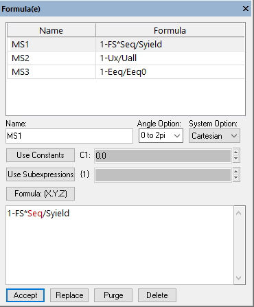 In order to define failure/margin criteria, one or more formulaic margin of safety (MS) expressions comprised of standard engineering functions must be specified in the Formulae dialog. These MS expressions are typically in the form of 1 – Ratio such that a negative value represents failure.