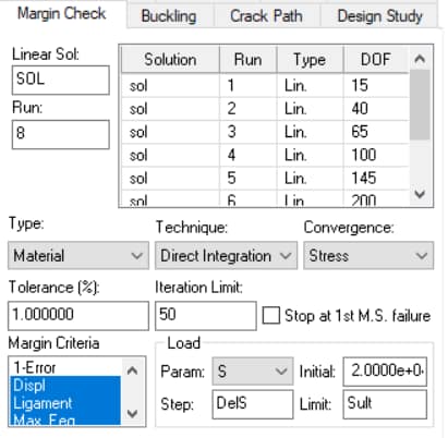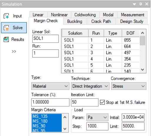 The Margin Check is a nonlinear analysis capability (material or general nonlinear) with failure criteria control. To solve a Margin Check analysis a linear problem must be solved first. A nonlinear material stress-strain law must be specified if a material nonlinear analysis is involved.