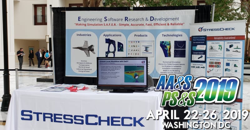 This past week at AA&S/PS&S 2019, ESRD’s Gordon Lehman provided a 2-hour training course titled “How Do You Verify the Accuracy of Engineering Simulations?”, chatted with attendees about StressCheck and how it supports detailed aerostructures analyses, and exhibited at our colorful & engaging booth (see above image).