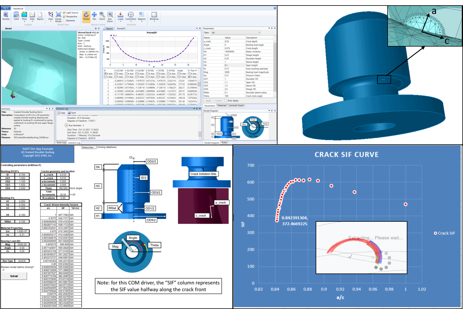 ESRD’s StressCheck Professional (GUI & API) and novel CAE Handbook software tools support the development & deployment of custom Sim Apps and/or digital engineering handbooks for the standardization and automation of durability & damage tolerance (DaDT) solutions. As a result, engineering organizations are empowered to develop a wide range of FEA-based options, from a simple parametric handbook for the computation of SIF’s for a range of crack aspect ratios, to a fully-scripted “homegrown” application for the analysis of 3D structures with multiple crack orientations & locations.
