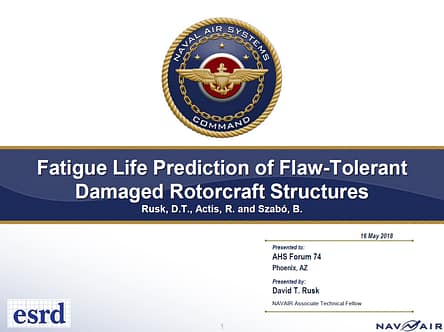 The presentation and paper report the work done by ESRD and NAVAIR under a SBIR program to develop an analytical approach to predicting the remaining useful fatigue life of metallic rotorcraft structural components with surface flaws. Below is the paper’s abstract: