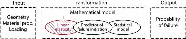 In this case, the transformation, represented by the right arrow in Equation (1), comprises three operators: One operator produces the solution of a problem of linear elasticity, or more generally, continuum mechanics. The second operator uses the solution from the first to predict failure initiation. The third operator accounts for the statistical dispersion of failure events. This is illustrated schematically in Figure 1.