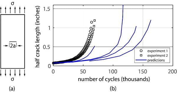 Figure 1: (a) Test article. (b) The results of experiments and predicted crack lengths.