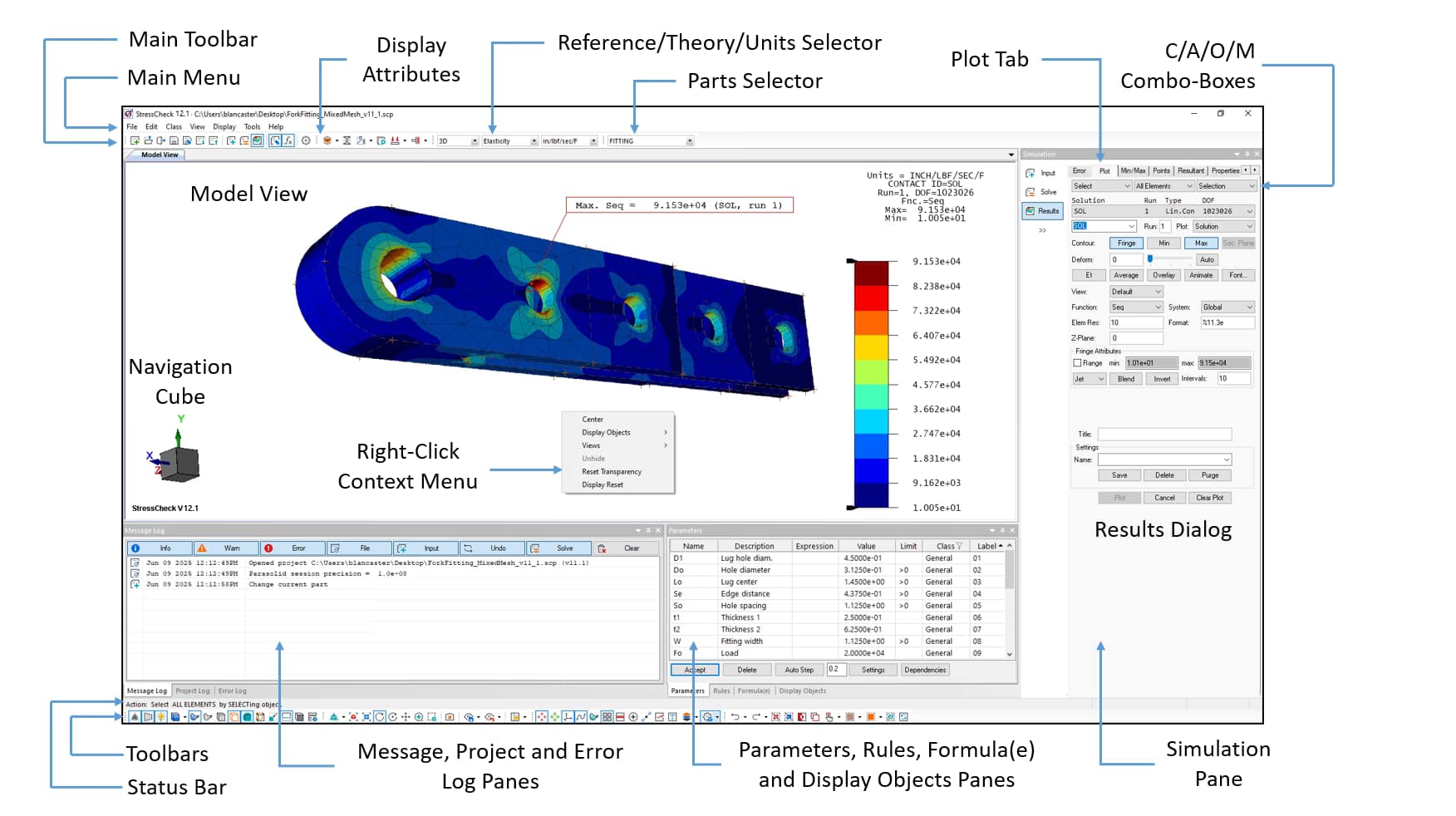 StressCheck Core is the primary building block of StressCheck Professional. It includes the 64-bit graphic user interface (GUI) and features a complete pre- and post-processor built around a parametric handbook framework that supports standardization of design and analysis processes.