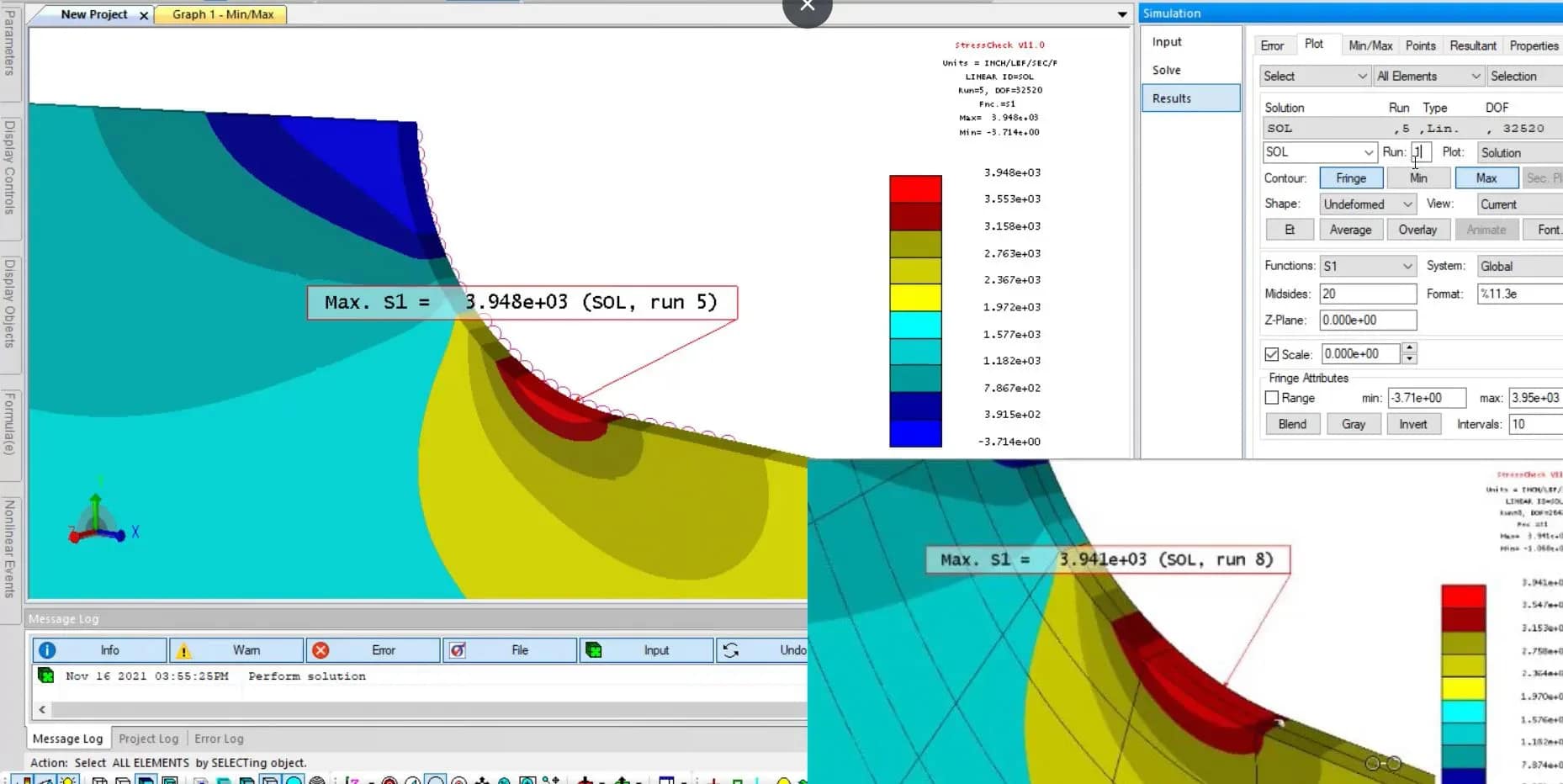Abstract: the exact solution of a mathematical model should be independent of how the finite element mesh was generated (i.e. manually or automatically), the number of elements used to construct the mesh, and/or the polynomial orders of the element displacement functions. In this demonstration, we show how a 3D stepped specimen peak stress result converges to practically the same magnitude and location for two different meshing strategies.