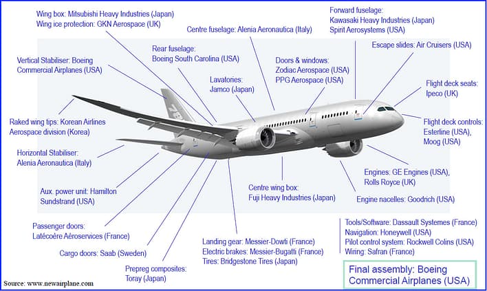 The high performance of the Boeing 787 Dreamliner is made possible by a complex interdependent global network of partners and suppliers with design engineering contributions, not just manufacturing.