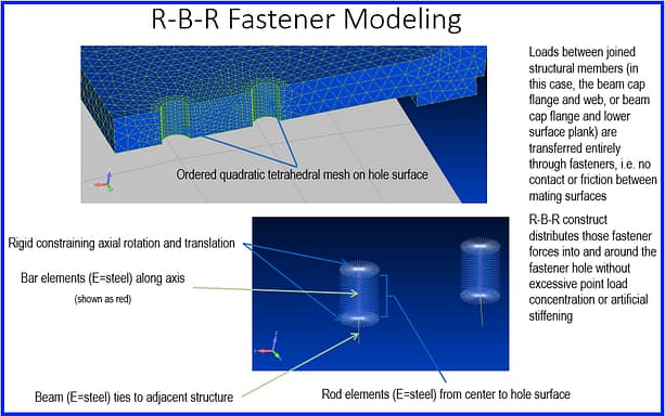 Example of loading fastener holes via Rigid Body Elements (RBE’s). Using RBE’s and other element libraries may be acceptable for expert users, but for non-experts they can be a source of unknown errors.