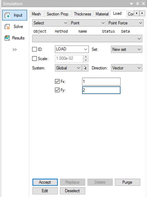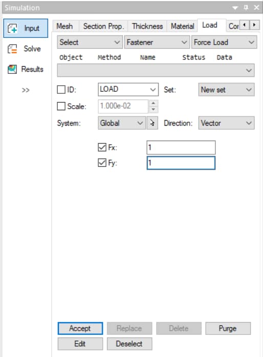 Force load means a concentrated force is applied to the core of a fastener element. Force loads may be applied in the global or any local Cartesian coordinate system.
