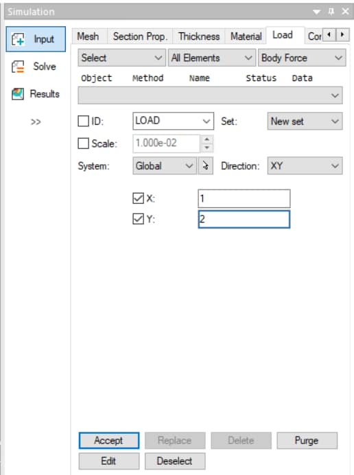 If the acceleration vector a = {ax, ay} and the mass density(ρ) are known then enter the products: X = axρ and Y = ayρ. Body forces can be applied to planar bodies, or quadrilateral, triangular and beam elements in the global or any local Cartesian coordinate system.