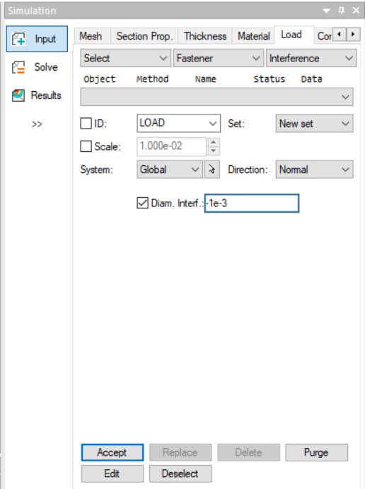 Magnitude of the diametral interference that can be specified to a fastener element. Note: a negative diametral interference input will be interpreted as a clearance fit.