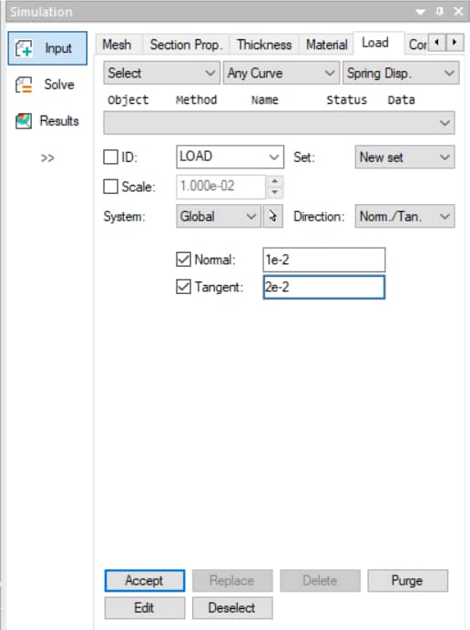 A traction load is applied through a displacement imposed on a distributed spring which has been specified on curve or element edge. Spring displacements may be applied in directional (XY) or normal-tangent (Norm./Tan.) reference frames, in the Global or a local system.