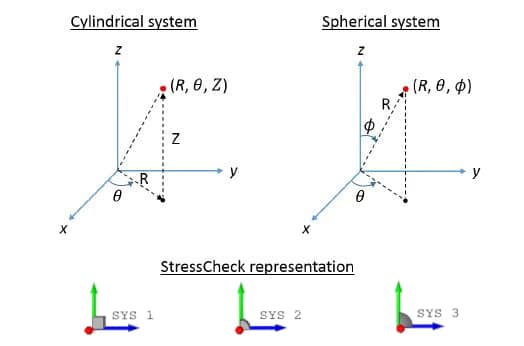 Local cylindrical (R, θ, Z) and spherical (R, θ, φ) coordinate systems are visually represented like Cartesian systems and are indicated by a C or S, respectively. The coordinate system conventions used in StressCheck are illustrated in Figure 3.