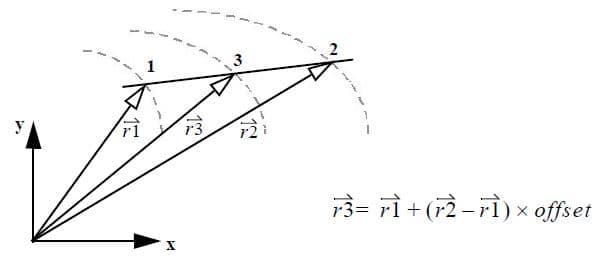 - Offset: Use the Offset method to construct a spline curve which is at a fixed distance from a reference curve. A series of sample points, the number of which is specified as an input value (Res:), is computed on the reference curve. The normal to the curve at each point is computed and a construction point is located on the normal vector at a fixed distance from the reference curve as specified by the input “offset” value as follows: