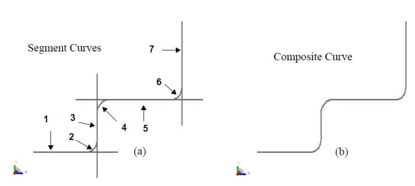 A composite curve is defined by connecting some number of 2D curves into a single composite curve. The resulting curve may subsequently be used to construct a tabulated cylinder, surface of revolution, ruled surface, or spline surface. The curve coordinates are defined in the range 0 ≤ P1 ≤ 1. The curve coordinates may be understood to be a fraction of the defined curve length.