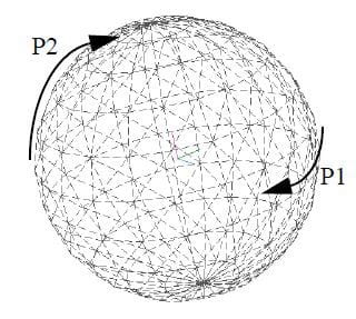 A sphere is defined by the coordinates of its center and a radius (Figure 16). The surface coordinates are defined in the range 0 ≤ P1 ≤ 360 (longitude), and -90 ≤ P2 ≤ 90 (latitude). A sphere can be created either as a surface or a solid object by switching between the Surface/Solid Toggle.