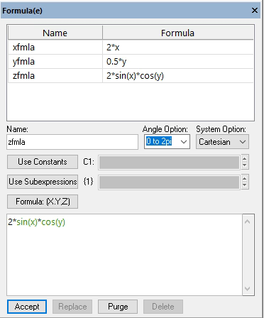 To create a Formula surface object, set the C/A/O/M to Create > Formula, and choose the desired method (see below for the supported methods).