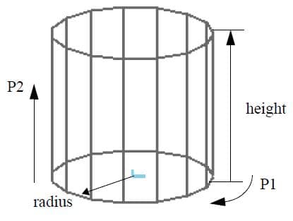 A cylinder is defined by the coordinates of the center of its base, a radius and a height (Figure 17). The surface coordinates are defined in the range 0 ≤ P1 ≤ 360 (circumferential direction), and 0 ≤ P2 ≤ 1.0 (along the cylinder axis). The P2 coordinate is understood to be a fraction of the defined height of the cylinder.