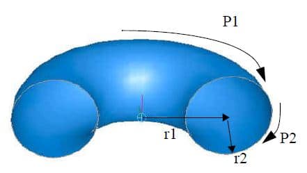 A torus is defined by the coordinates of the center of its base, a major radius (R1), and a minor radius (R2). The surface coordinates are defined in the range 0 ≤ P1 ≤ 360 (along the circumference corresponding to R1), and 0 ≤ P2 ≤ 360 (along the circumference corresponding to R2). These dimensions are illustrated in Figure 19. A torus can be created either as a surface or a solid object by switching between the Surface/Solid Toggle.