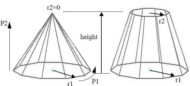 A cone is defined by the coordinates of the center of its base, a base radius (R1), a top radius (R2), and a height (Figure 18).