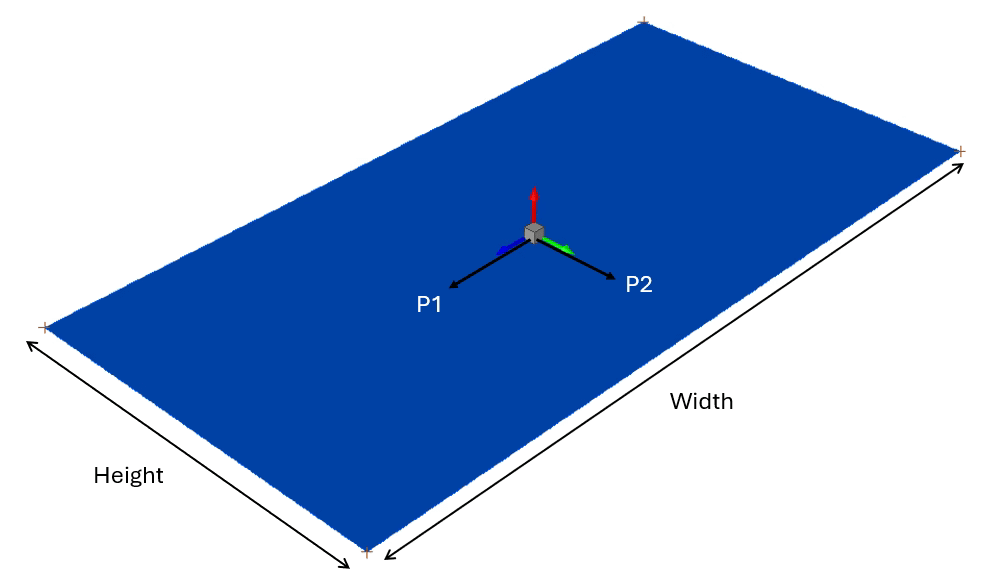 A plane is defined by the coordinates of its local origin, a width and a height. The surface coordinates are defined in the range -0.5 ≤ P1 ≤ 0.5, and -0.5 ≤ P2 ≤0.5. The surface coordinates may be understood to be a fraction of the actual dimension of the plane in each direction (Figure 6). When using the 3-Pt Plane method, the local origin is located at the first point picked.