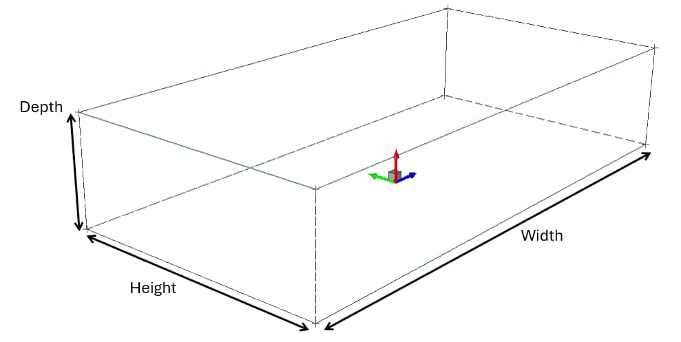 A box is defined by the coordinates of the center of its base (X,Y,Z), the width (X-dimension), height (Y-dimension), and depth (Z-dimension). These dimensions are illustrated in Figure 20. A box can be created as either a surface or a solid object by switching between the Surface/Solid Toggle.