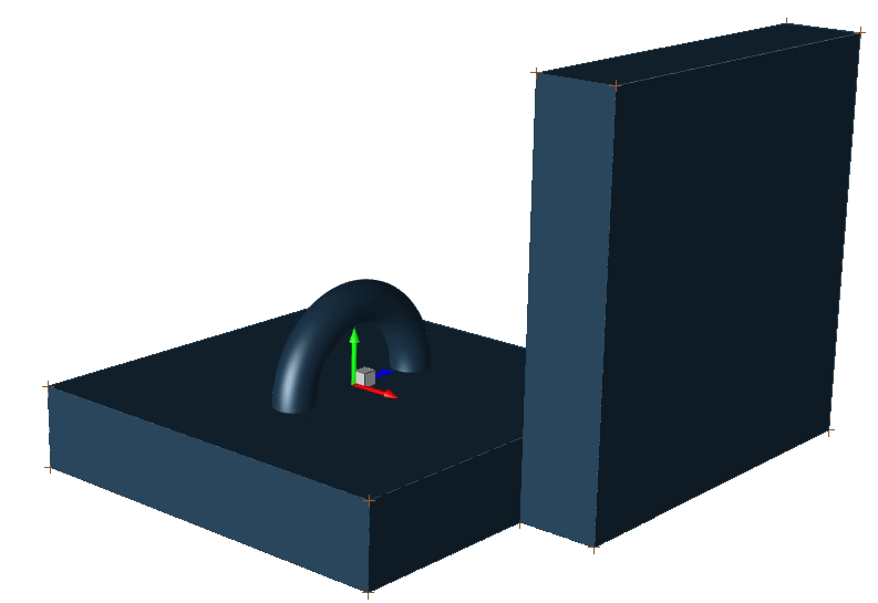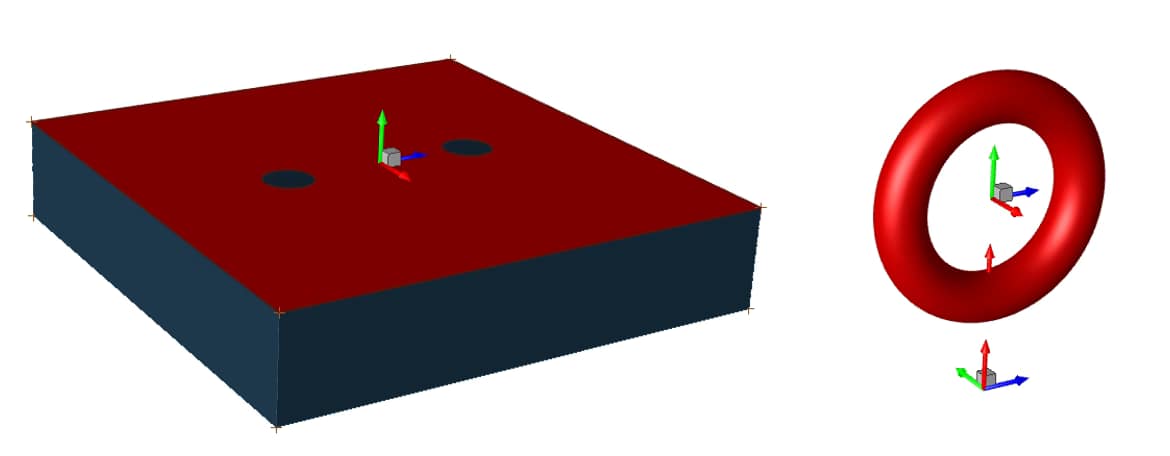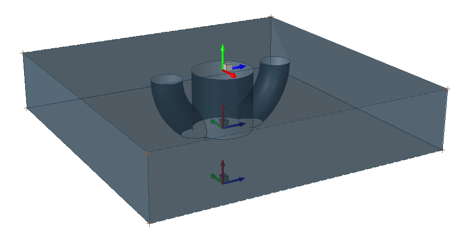 Figure 4a shows three solid bodies before a boolean subtraction operation, and Figure 4b shows the resulting solid body. In this case, the box was the target body.