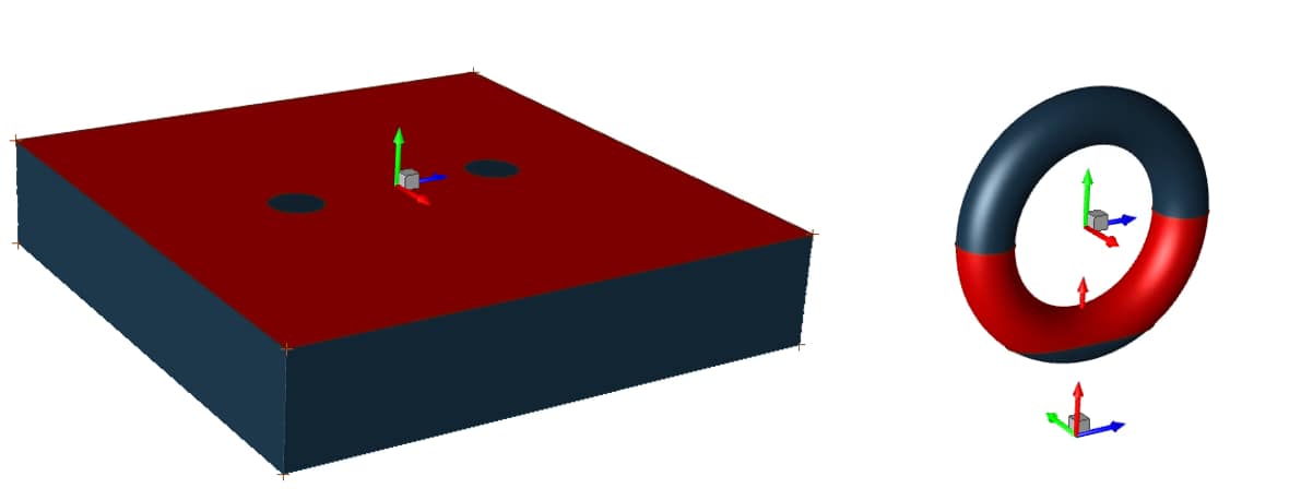 Figure 9a shows two solids before a Target Body operation, and Figure 9b shows the resulting bodies when the target body is the box. Note the new boundaries only appear on the box where the torus intersected it.