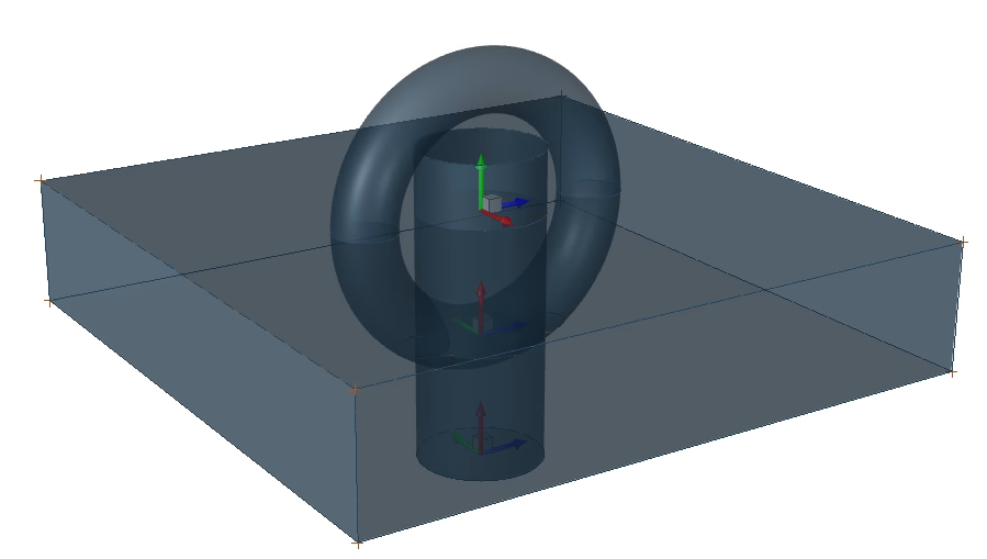 The Bool-Intersect (boolean intersection) method is used to create a new solid body by computing the shared region(s) between two or more intersecting solid bodies. There can only be one target (several tool objects are possible) object for a boolean intersection operation. Simply select the target body (which will highlight green), then the tool body (or bodies, which will highlight red), and click Accept or hit the Enter key.