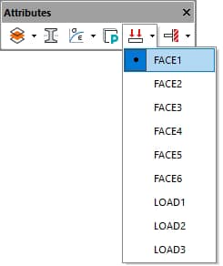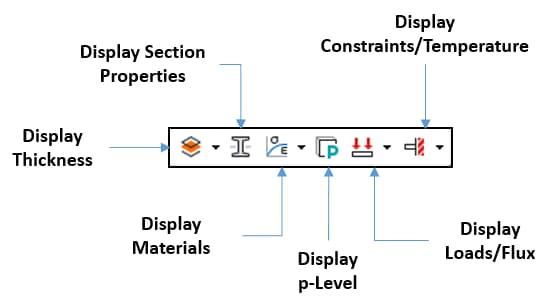 The View > Toolbars > Attributes Toolbar provides icons for quick access to the model attributes (materials, loads, constraints, etc.) in the Model View display area. Attributes are displayed as symbols, labels, colors, etc. Note: enabling the “ID:” (or similarly labeled) check boxes in the Section Properties, Thickness, Material, Load, Constraint or p-Discretization tabs will enable the corresponding attribute toggles.