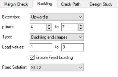 As in a Linear analysis, you may choose the type of extension to perform during the Buckling analysis, Upward-p or Downward-p. These have the same interpretation as in a Linear analysis, as do the p-limits. NOTE: In the case of “thin” bodies, locking will occur at low p-levels, so let p range between 3 to at least 6.