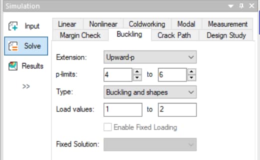 Then, select the Buckling tab in the Solve dialog, specify the solution options, and click the Solve button. For an example of setting up and executing a buckling analysis, refer to StressCheck Demo: Shear Panel Buckling Load Factor Analysis.