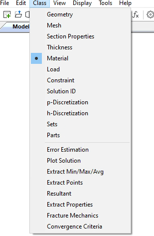 Classes provide the basic organizational structure for input and results interaction in StressCheck. Input classes include Geometry, Mesh, Thickness, Section Properties, Material, Load, Constraint, etc. Each Input class provides access to model objects and input data records which define the model. Learn more about input classes in Model Inputs Overview.