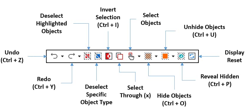 The View > Toolbars > Edit Toolbar provides icons for quick access to object editing features which may be used to cancel selected objects, hide selected objects, unhide hidden objects, and to undo or redo previous operations. Below are brief descriptions of commonly used Edit Toolbar icons (Figure 1):