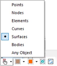 - Clicking the down arrow of the Select Objects icon allows the user to limit the selection to a specific object type (e.g. Points, Nodes, Elements, etc.).