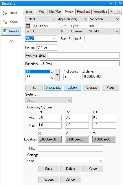 To perform pointwise data extractions for a solved StressCheck model, select the Points tab in the Results dialog and specify the desired Points extraction options (Figure 1).