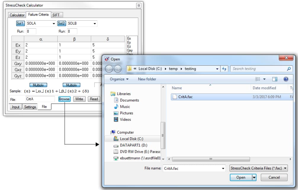 To save a set of input factors to a file, type the name of the file in the input field and click on the Write button. The file will be placed in the same directory as the current StressCheck session. To select a different directory, click on the Browse button first to select the location for the file. To retrieve a previously saved file, click on the Browse button to select the file and then click on the Read button.